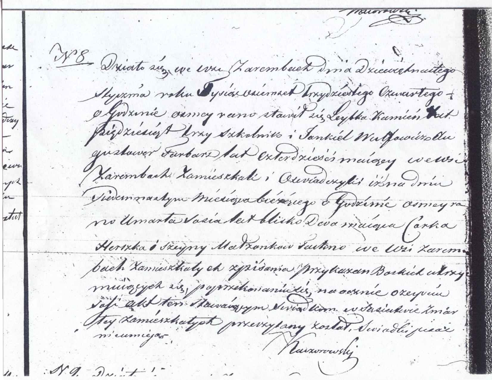 It happened in the village of Zaremby on the nineteenth of January, eighteen hundred thirty four at eight o’clock in the morning.  The Jew Leybka Kamien, age fifty three, synagogue sexton, and Jankiel Wulfowicz Augustower, a dyer, age forty, both of whom are residing in the village of Zaremby, appeared and testified that on the seventeenth of the current month at eight o’clock in the morning died Sosia, almost two years old, daughter of Herszko and Szeyna married couple Tachna, residing in the village of Zaremby and earning their living from the writing of G-d’s Commandments [Torah Scribe].  After having convinced ourselves with our own eyes of the death of Sosia, this document was read to the witnesses, who live in the neighborhood of the deceased.  The witnesses cannot write.