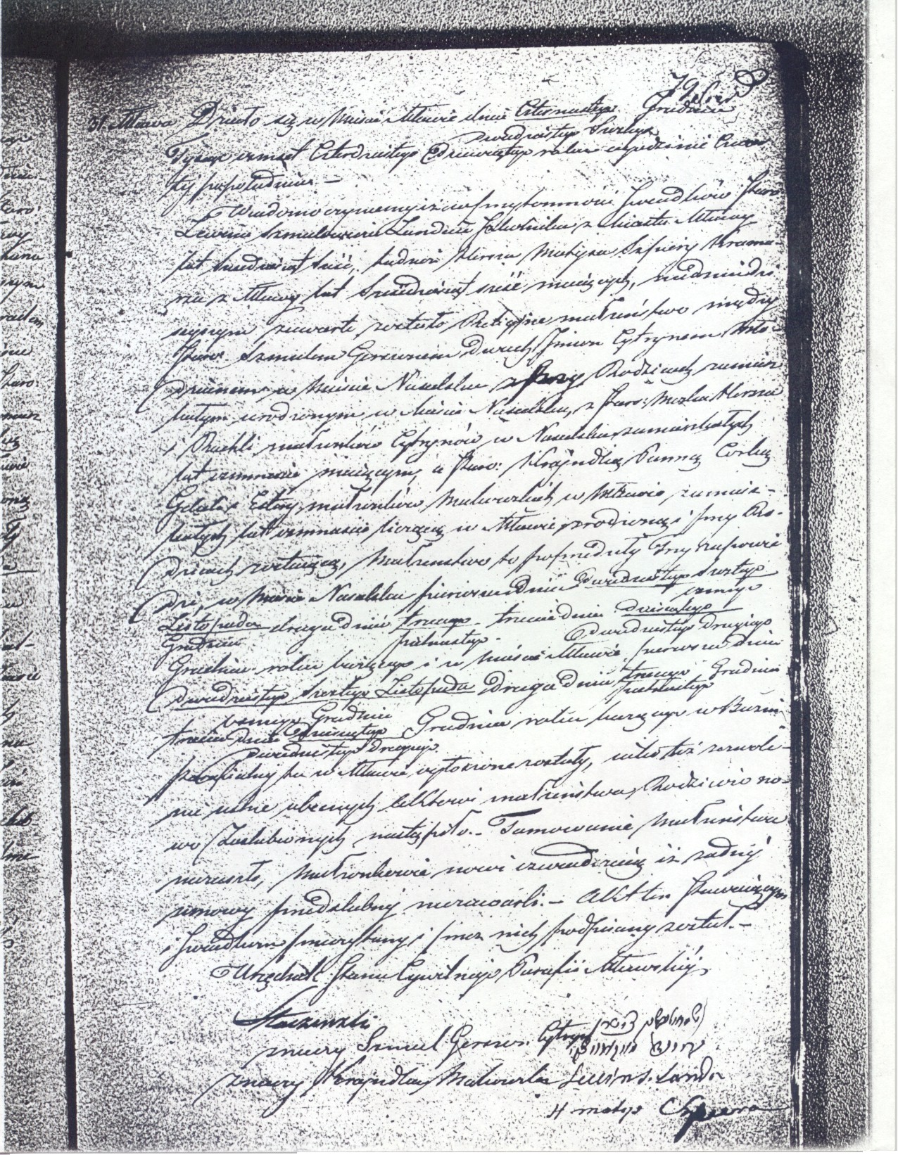 It happened in Mlawa on the fourteenth/twenty sixth of December eighteen hundred and forty nine at four o’clock in the afternoon.  It is known that in the presence of witnesses the Jews Luwin Szmulowicz Landau, teacher from Mlawa sixty six years old, a religious marriage was contracted today between Jews Szmul Gershon [Shmuel Gershon] Cytryn, young man from the town Nasielsk living with his parents, born in Nasielsk, eighteen years old son of Moszek Hersh [Moshe Tzvi] and Ruchli Cytryn married couple; and Krajndla not married young lady daughter of Gedale [Gedaliah] and Ester Makowicki residing in Mlawa eighteen years old, living with her parents.  The marriage preceded three bans in Nasielsk, the first on the twenty sixth of November, second on the third/fifteenth of December, the third on the ninth/twenty second of December of the current year in the parish synagogue were announced.  Also oral permission by the parents was given.  There was no objection by the parents.  The newlyweds declared that they did not make any premarital agreements between themselves.  The document was read to the appearing witnesses and signed by them.