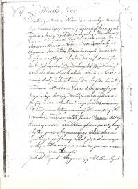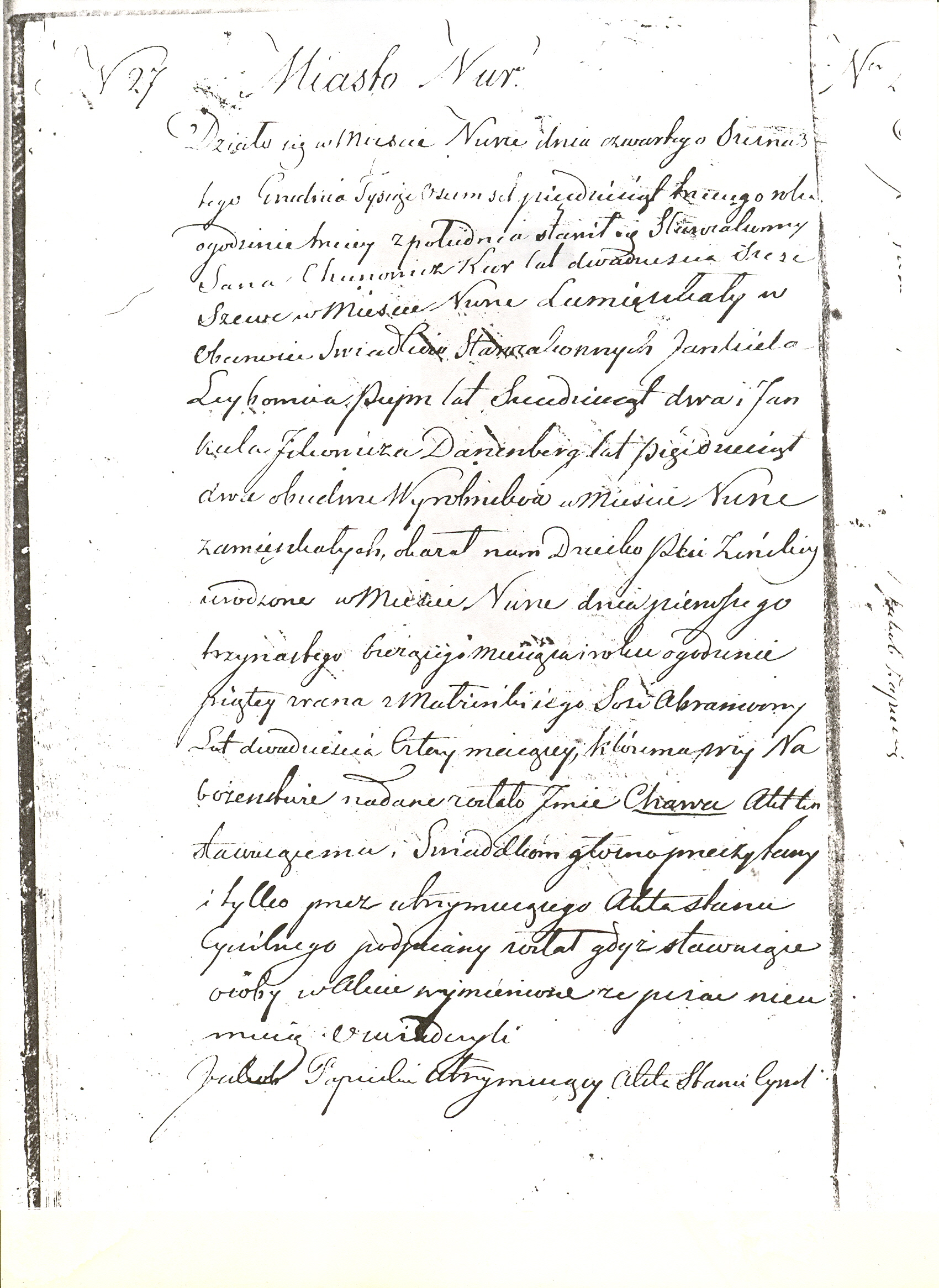 It took place in the city of Nur, on December fourth/December twelfth, eighteen hundred and fifty three, at three o’clock in the afternoon.  Sana Chunowicz Kur, a Jew, age twenty six years old, a shoemaker from Nur, have appeared with two Jews: Jankiel Lejbowicz Pieprz , age sixty two years old, and Jankiel Ickowicz Danenberg, age fifty two years old, both laborers from Nur.  He showed us a baby girl testifying that she born in the city of Nur, on December first/December thirteenth, eighteen hundred and fifty three, at five o’clock in the morning, to his wife Sosa Abramowna, age twenty four years old.  During the ceremony the baby was named Chawa.  This document was read, loud and intelligibly, to testifiers and signed by a clerk because all testifiers are illiterate.