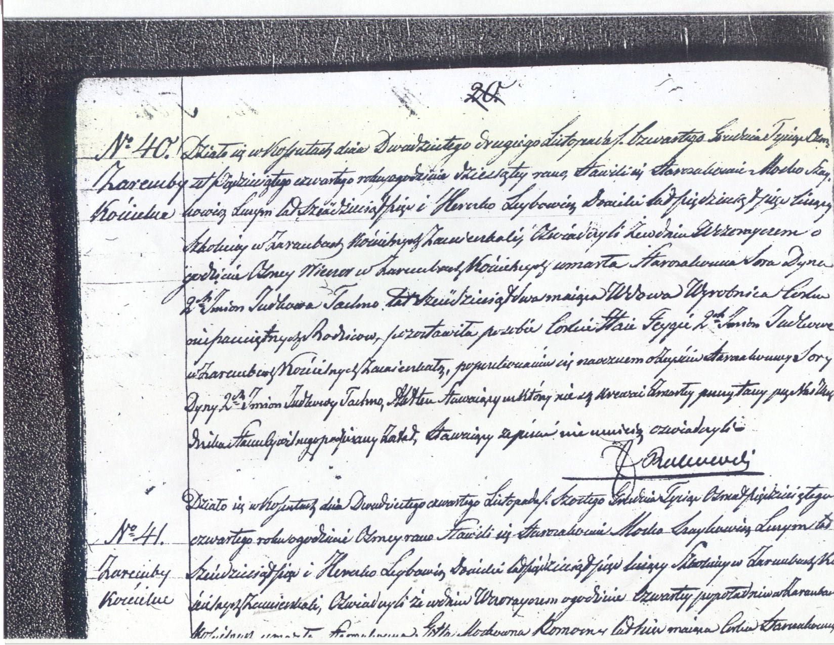 It happened in Kossuty on the twenty second of November / fourth of December, eighteen hundred fifty four at ten o’clock in the morning.  The Jews Mosko Szaykowicz Luzym, age sixty five, both of whom are synagogue sextons residing in Zareby Koscielne, appeared and testified that yesterday at eight o’clock in the evening in Zareby Koscielne died the Jew Sora Dyna [Sara Dinah] two given names Judkowa Tachna, age sixty two, widow, day laborer, daughter of unknown parents, leaving her daughter Haia Feyga [Chaya Fayga daughter of Yehuda Ha-Levy] two given names Judkowna residing in Zareby Koscielne.  After having convinced ourselves with our own eyes of the death of the Jew Sora Dyna two given names Judkowa Tachna, this document was read to those who appeared, who are not related to the deceased, and signed by us, Official of the Civil Registry, whereas the witnesses testified that they cannot write.