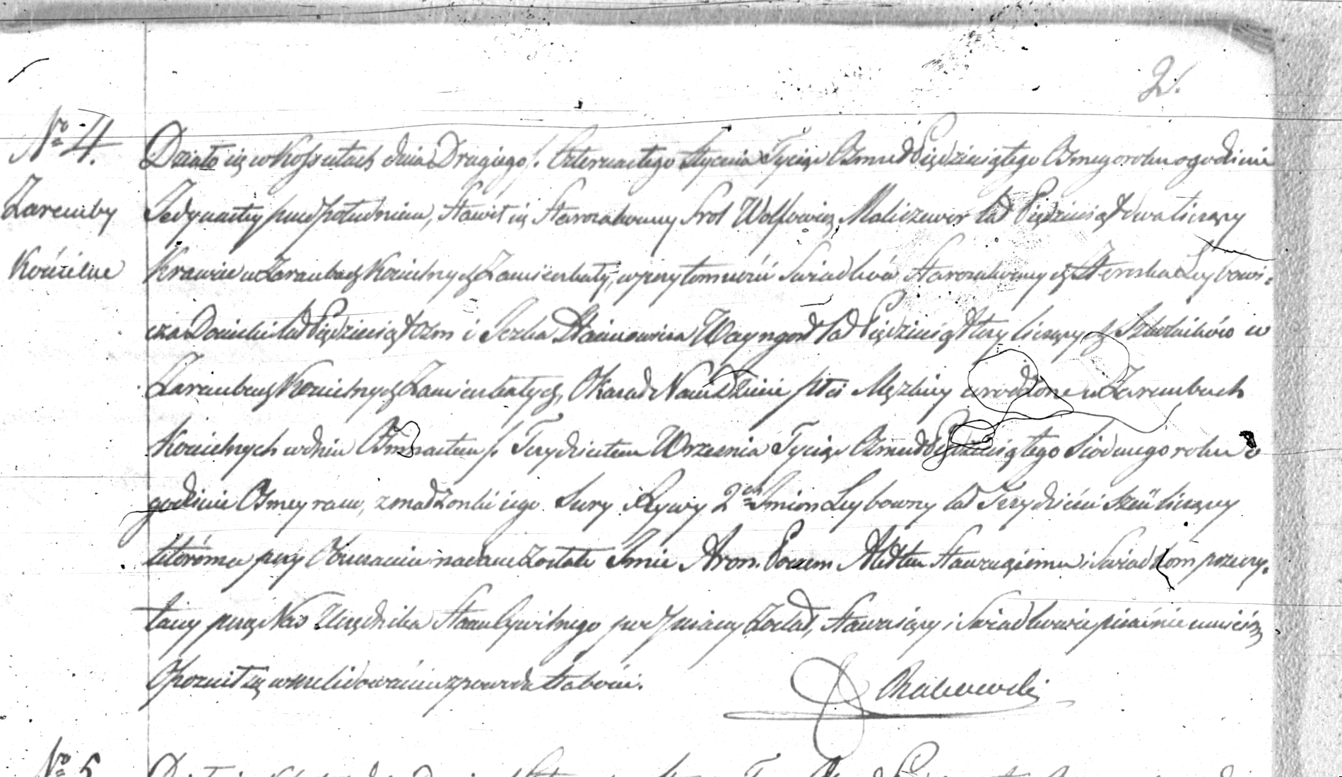 It took place in Kosuty on January second/January fourteenth eighteen hundred and fifty eight, at ten o’clock in the morning. Srol Wolfowicz Maliszewer, age fifty two year old Jew, a tailor, residing in Zaremby Kościelne, appeared with two Jewish witnesses: Herszek Leybowicz Donicki, age fifty eight years old, and Josek Haimowicz Wayngort, age fifty three years old, both teachers, residing in Zaremby Kościelne. He showed us a baby boy, testifying that a child was born in Zaremby Kościelne on September eighteenth/September thirtieth, eighteen hundred and fifty seven, at eight o’clock in the morning. Baby was born to his wife Sura Rywa (first name and middle name) Leybowna, age thirty six years old.  His wish is to name this baby Aron.  The document was read to the testifier and witnesses, and signed by a clerk of the register office. The testifier and witnesses are illiterate. The delay was caused by the illness.