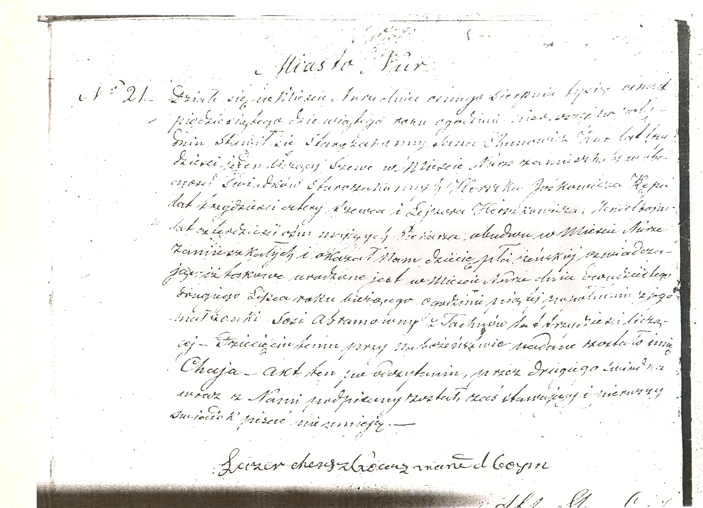 It took place in the city of Nur, on August the eighth, eighteen hundred and fifty nine, at one o’clock in the afternoon.  Sana Chunowicz Kur, a Jew, age thirty one years old, a shoemaker, have appeared with two Jews: Herszek Jośkowicz Kęp, age thirty four years old, a shoemaker, and Lejzor Herszkowicz Mendelbajm, age forty eight years old, a baker, both from Nur. He showed us a baby girl testifying that she was born in the city of Nur, on July the twenty second, eighteen hundred and fifty nine at five o’clock in the evening to his wife Sosa Abramowna née Tachna, age thirty years old. During the ceremony the baby was named Chaja. This document was read and signed by a second testifier and a clerk of the registry office because father and a first testifier are illiterate.