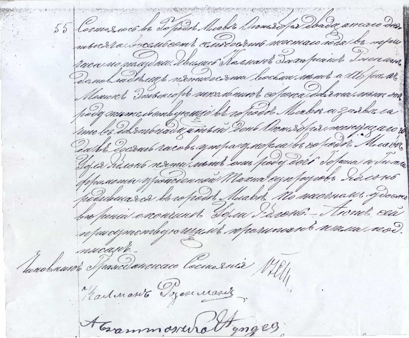 It happened in the town of Mlawa on October the twentieth, eighteen hundred and seventy six at three o'clock in the afternoon. Kalman Zachariasz Rozenman, house-owner, fifty eight years old, and Abram Moszek Etynger, synagogue sexton, forty nine years old, both of whom residing in the town of Mlawa, appeared and testified that on the nineteenth of October of the current year at ten o'clock in the morning died in the town of Mlawa Udla Jablon, five years old, daughter of Hersz and Gitla Frimeta née Tachna married couple Jablon, born in the town of Mlawa. After having convinced ourselves with our own eyes about the death of Udla Jablon this document was read to those who appeared and signed.