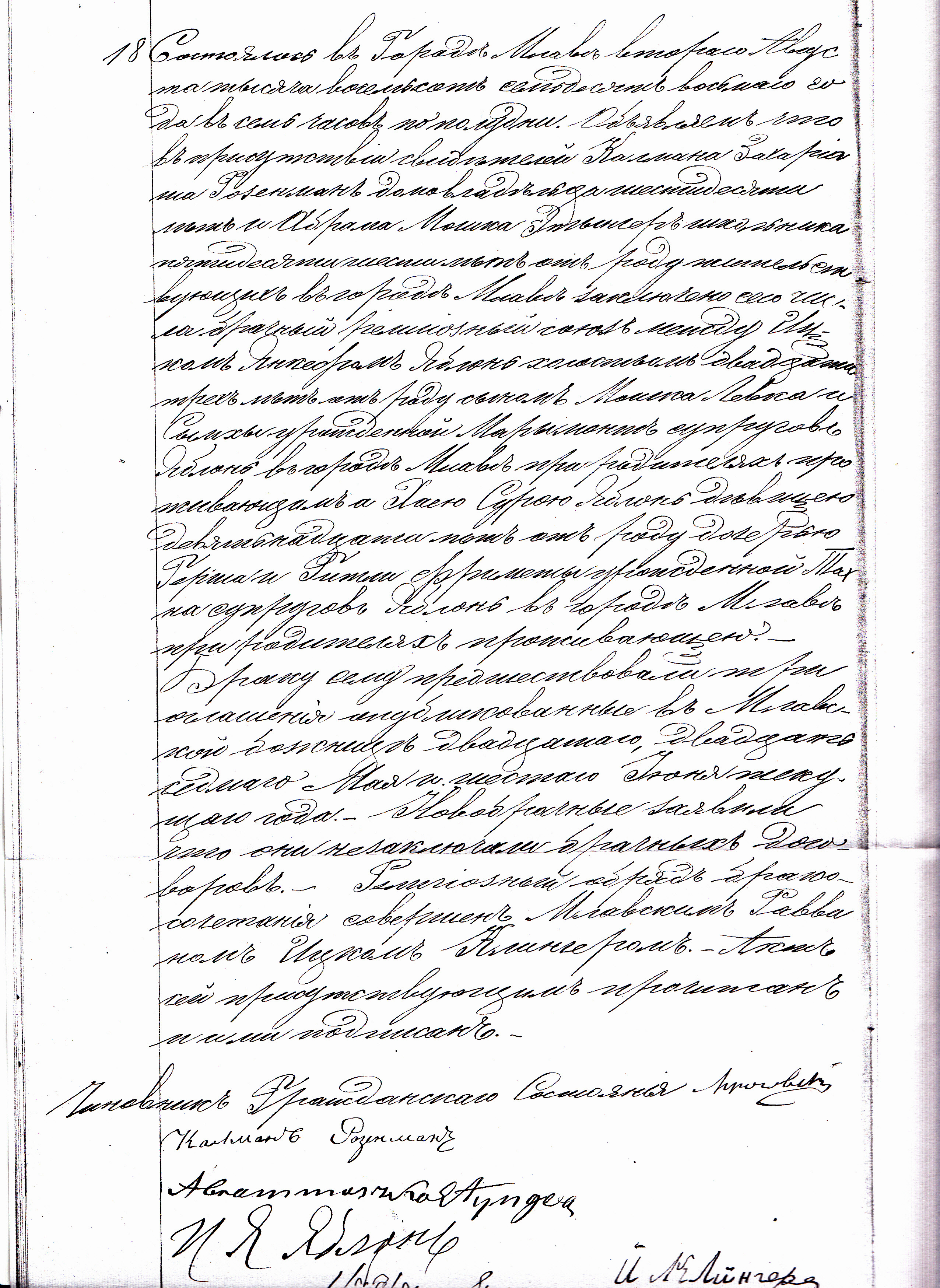 It took place in the town of Mława, on August the second, eighteen hundred and seventy eight, at seven o’clock in the evening.  The wedding ceremony took place today in the presence of the following witnesses: Kalman Zachariasz Rozenman, a tenement house owner, age sixty years old, and Abram Moszko Etynger, yeshiva teacher, age fifty six years old, residing in the town of Mława.  Icek Jankief Jabłoń, bachelor, age twenty three years old, son of Moszko Lewek Jabłoń and Symcha née Marymont, residing in the town of Mława with his parents, married Chaja Sura Jabłoń, bachelorette, age nineteen years old, daughter of Hersz Jabłoń and Gitla Frimet née Tachna, residing in the town of Mława with her parents.  Three banns of marriage have been announced in the synagogue in Mława, on the twentieth, the twentyseventh of May, and the sixth of June, this year.  The newlyweds haven’t signed any prenuptial agreement.  The couple was blessed by Rabbi of Mława, Icek Klinger.  This document was read to the appearing and signed by them all.