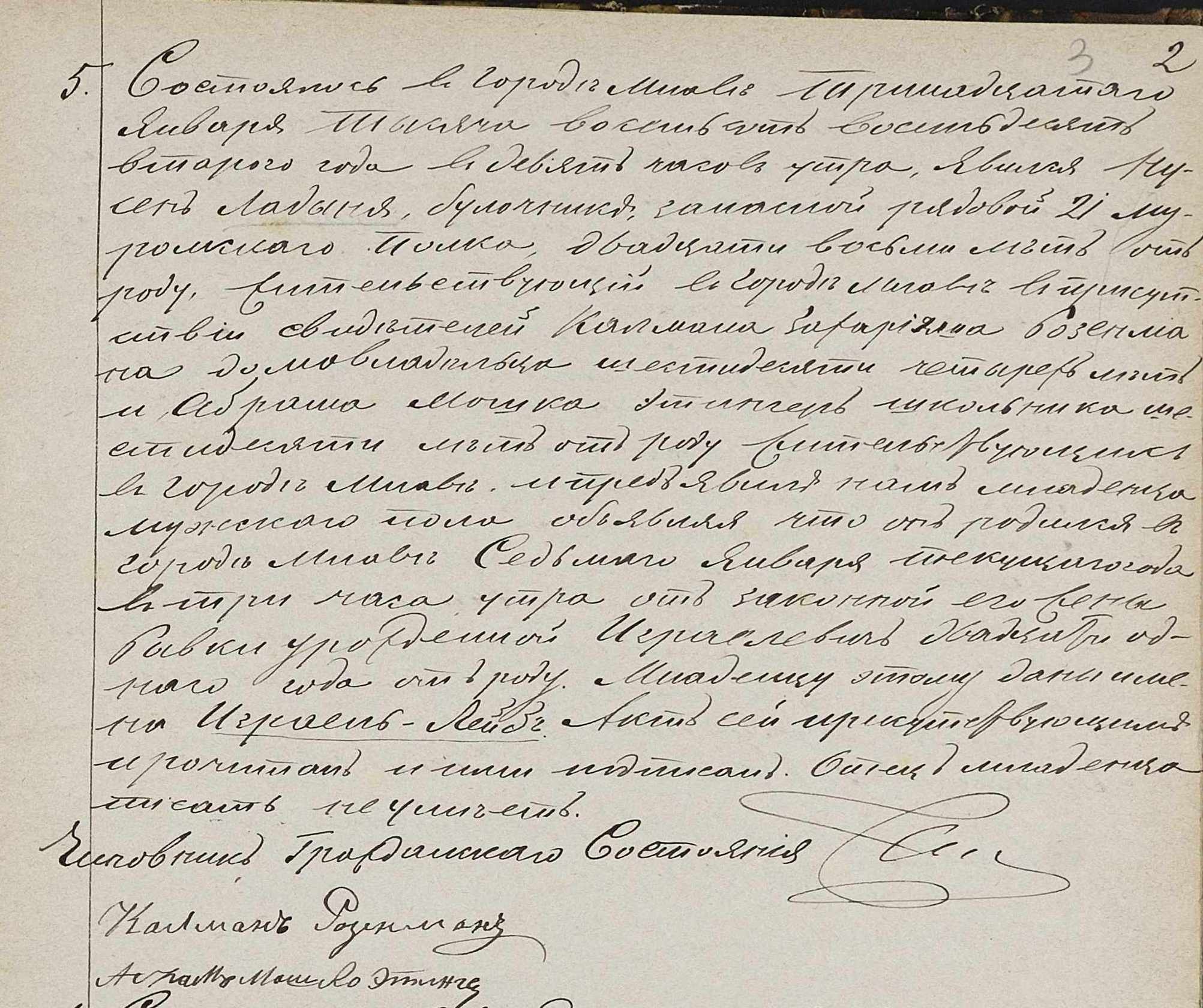It took place in Mława on the thirteenth of January one thousand eight hundred and eighty two at nine o’clock in the morning.  Nusen Ładynia, baker, reservist of the 21st Muromsk Infantry Regiment, age twenty eight years old, residing in Mława, appeared with Kalman Zachariasz Rozenman, proprietor, age sixty four years old, and Abram Moszek Etinger, Cheder teacher, age sixty years old, [both] residing in Mława.  He showed us a baby boy, testifying that the child was born in Mława on the seventh of January this year at three o’clock in the morning, to his wife, Ryfka née Izraelewicz, age twenty one years old. The child was named Izrael Lejb.  This document was read to the testifier and witnesses and signed by all of us except for the child’s father who is illiterate.