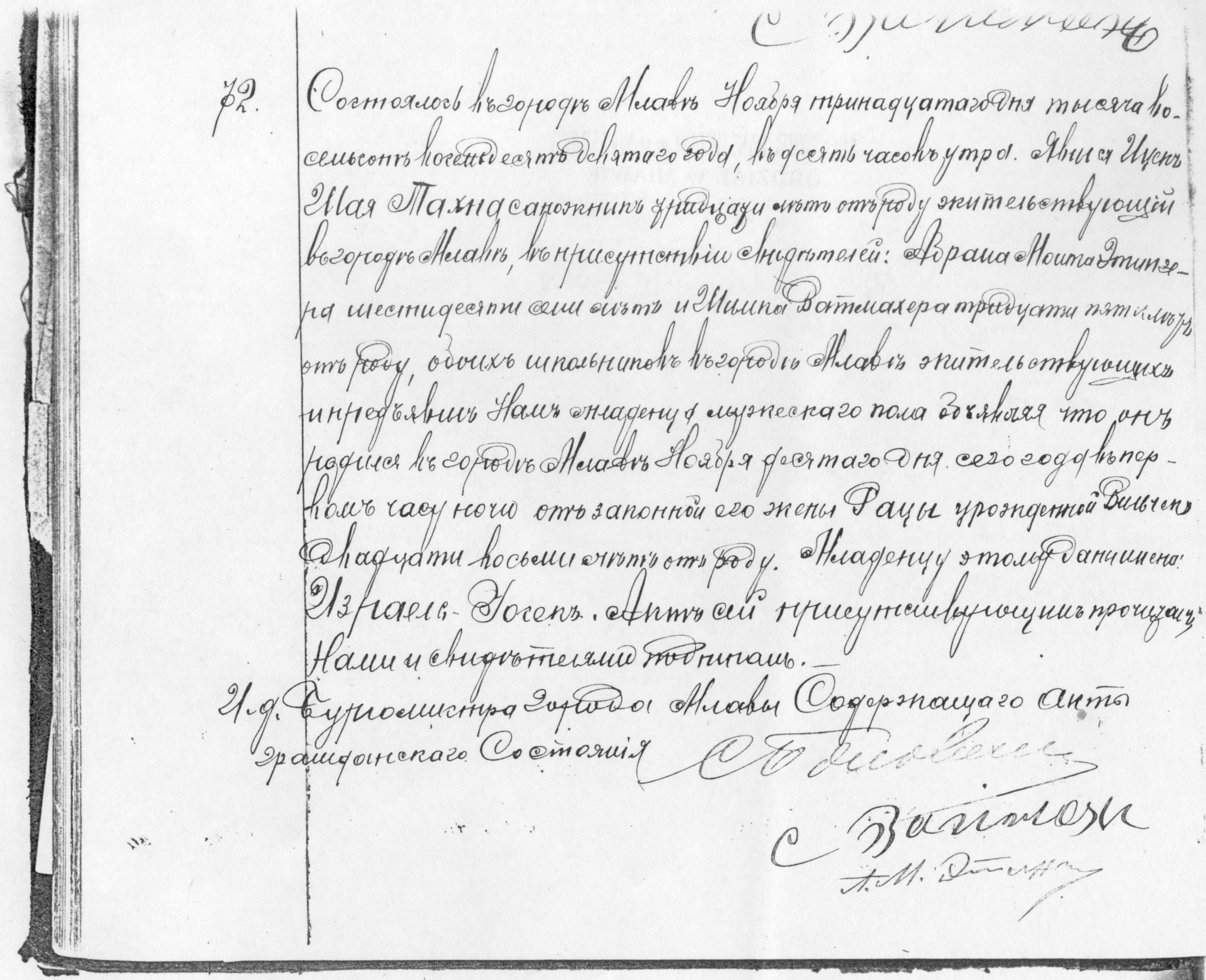 It happened in the town of Mlawa on the thirteenth of November, eighteen hundred and eighty nine at ten o’clock in the morning. Icek Szaja Tachna, shoemaker, age thirty, residing in the town of Mlawa, appeared in the presence of the witnesses Abram Moszek Etynger, age sixty seven, and Szymcha Watmacher, age thirty five, both of whom synagogue sextons residing in the town of Mlawa, and presented us a child of male gender, declaring that it was born in the town of Mlawa on the tenth of November of this year at one o’clock at night to his wedded wife Raca née Wilczek, age twenty eight. This child was given the names Izrael Josek. This document was read aloud to the ones present and signed by Us and the witnesses.