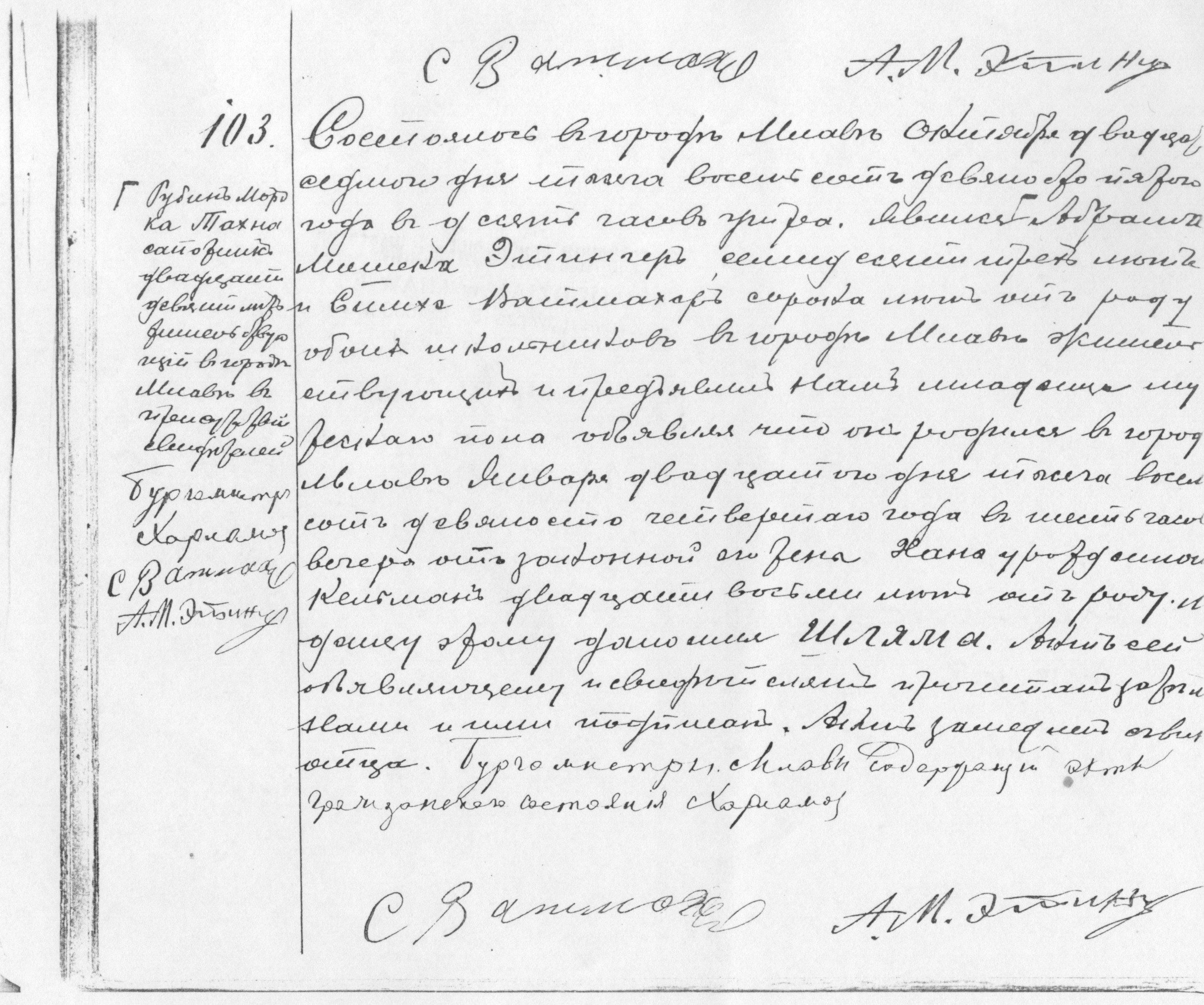 the presence of the witnesses ┐Abram Moszek Etynger, age seventy three,