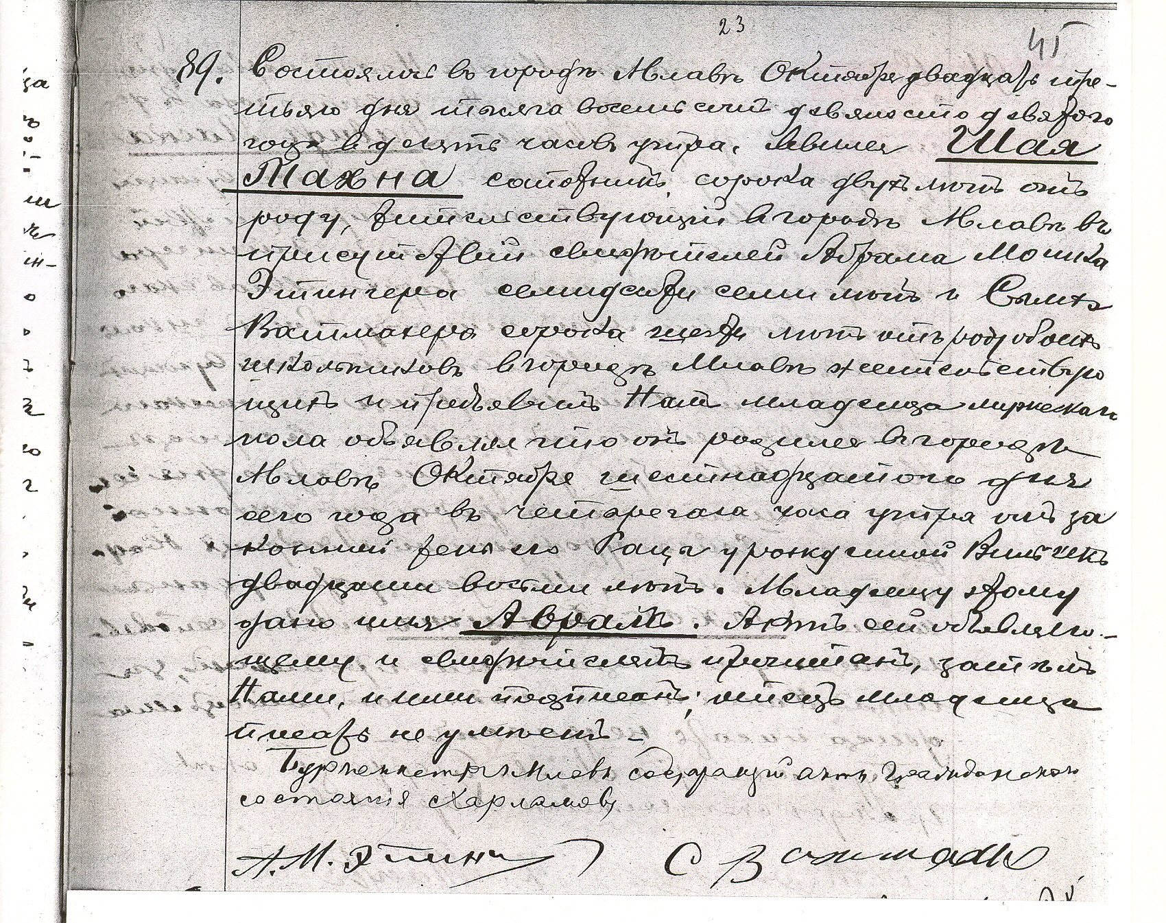 It took place in the city of Mława, on October the twenty third, eighteen hundred and ninety nine, at ten o’clock in the morning.  Szaja Tachna, a Jew, age forty two years old, residing in the city of Mława, have appeared with Abram Moszek Etinger, a Jew, age seventy seven years old, and Simcha Watmacher, a Jew, age forty six years old, teachers of yeshiva in the city of Mława.  He showed us a baby boy who was born in the city of Mława, on October the sixteenth, eighteen hundred and ninety nine, at four o’clock in the morning, to his wife Ruchla Wilczek, age twenty eight years old.  The baby was named Awram.  This document was read to testifiers and signed by them and a clerk of the register office.