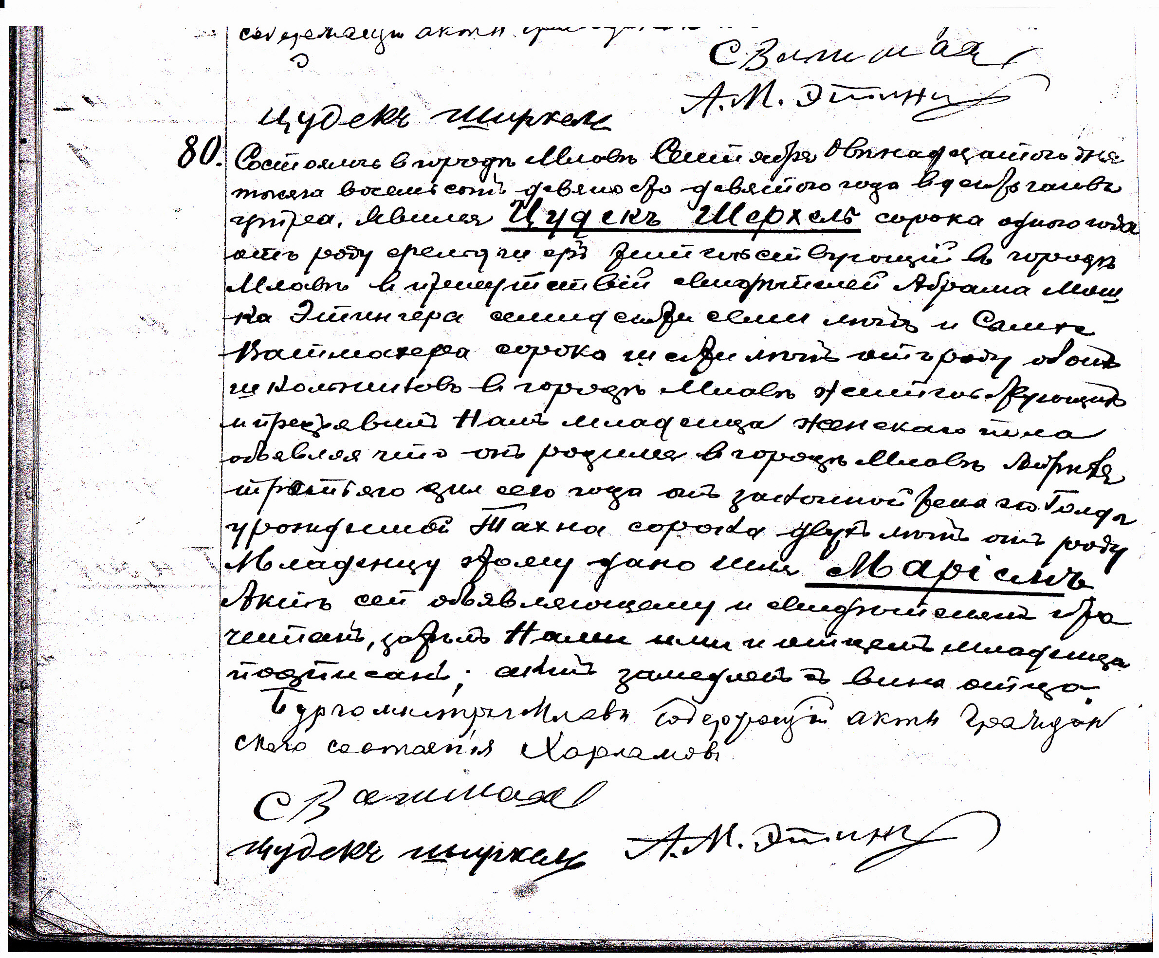 It took place in the town of Mława, on September the twelfth, eighteen hundred and ninety nine, at ten o’clock in the morning. Cudek Szerchel, age forty one years old, a Feldsher, residing in Mława, have appeared with Abram Moszek Etinger, age seventy seven years old, and Samcha Watmacher, age forty six years old, teachers at yeshiva, residing in the town of Mława.  He showed us a baby girl who was born in the town of Mława, on April the third, eighteen hundred and ninety nine; to his wife Gołda née Tachna, age forty two years old.  The baby was named Maryjem.  This document was read to testifiers and signed by all of us.