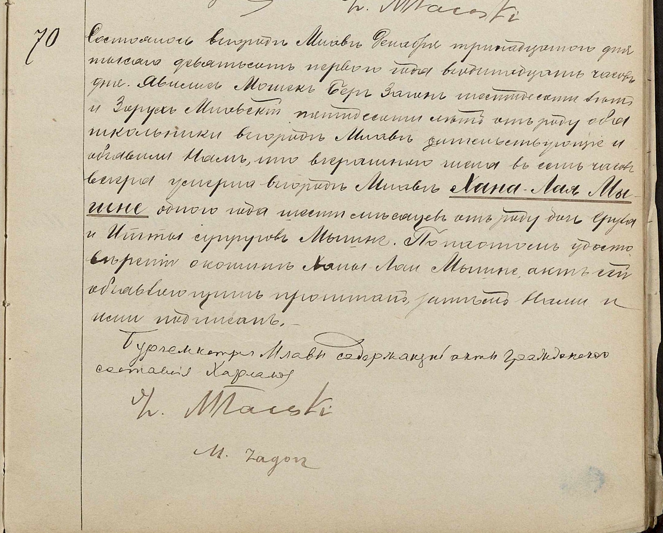 It took place in Mława on the thirtieth of December one thousand nineteen hundred and one at eleven o’clock in the morning.  Moszek Ber Zagon, age sixty years old, and Zaruch Mławski, age fifty years old, both Cheder teachers residing in Mława, appeared testifying that Chana Laja Myszne, age one year and six months old, passed away in Mława yesterday at seven o’clock in the evening.  She was the daughter of Srul Myszne and Itta. We have confirmed death of Chana Laja Myszne.  This document was read to the witnesses and signed by all of us.