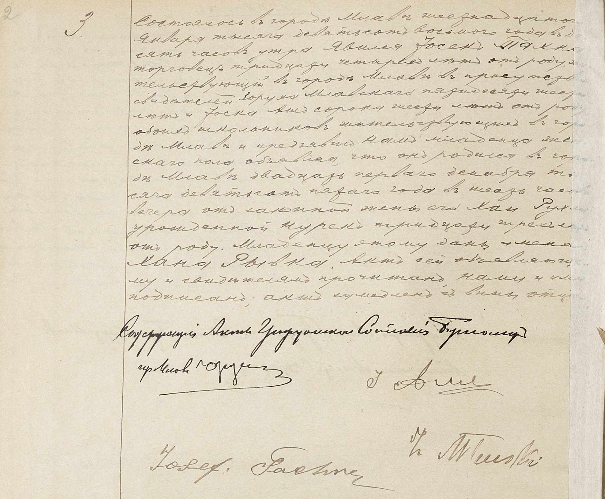 It took place in Mława on the sixteenth of January one thousand nine hundred and eight at ten o’clock in the morning.  Josek Tachna, peddler, age thirty four years old, residing in Mława, appeared with Zoruch Mławski, age fifty six years old, and Josek Asz, age forty six years old, both Cheder teachers residing in Mława.  He showed us a baby girl, testifying that the child was born in Mława on the twenty first day of December one thousand nine hundred and five at six o’clock in the evening, to his wife, Chaja Ruchla née Nurek, age thirty three years old. The child was named Chana Ryfka.  This document was read to the witnesses and signed by all of us.