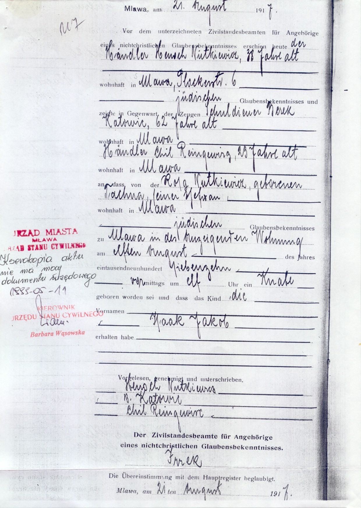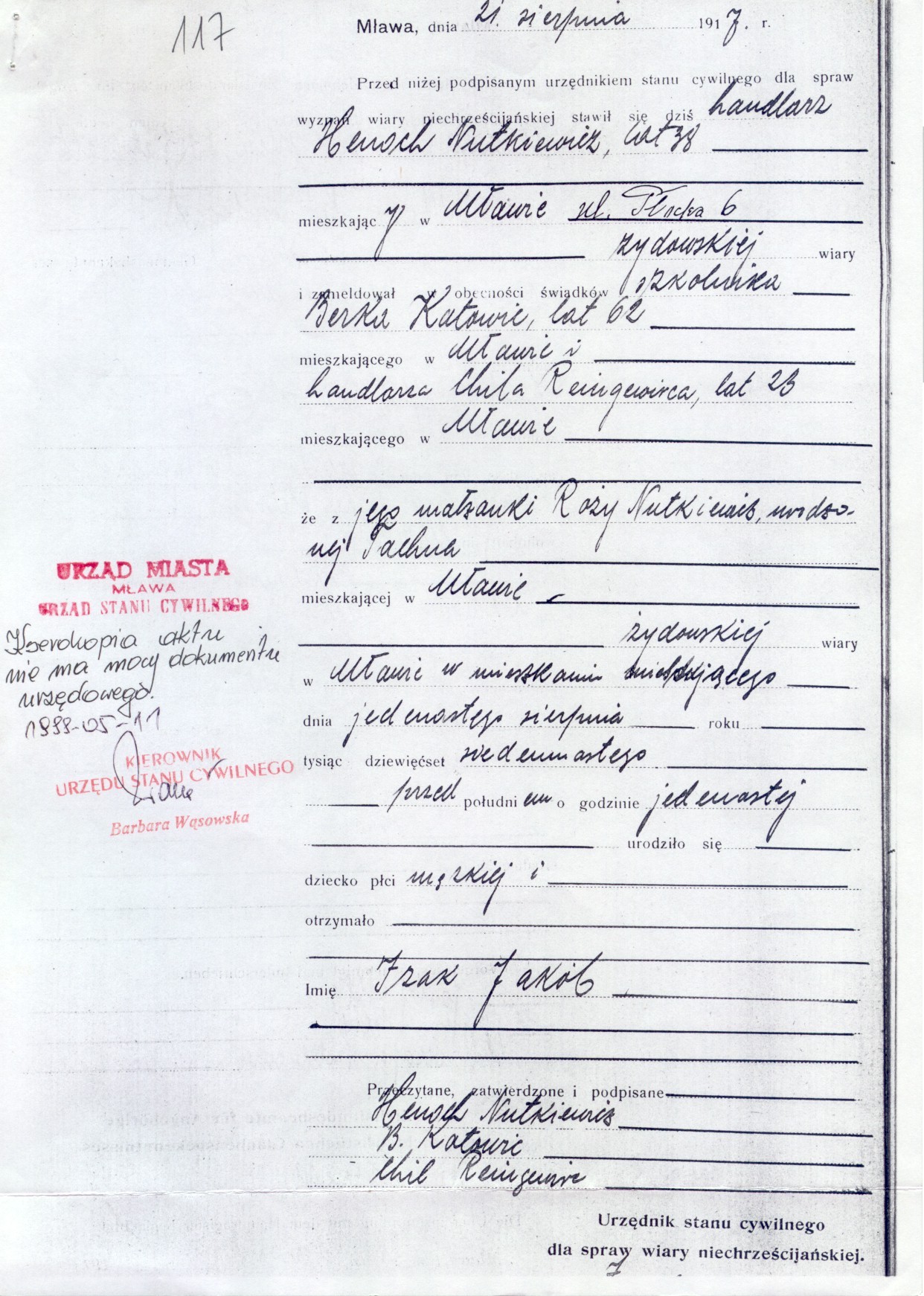 witnesses: the synagogue sexton Berek Katowic, age 62 residing in Mlawa