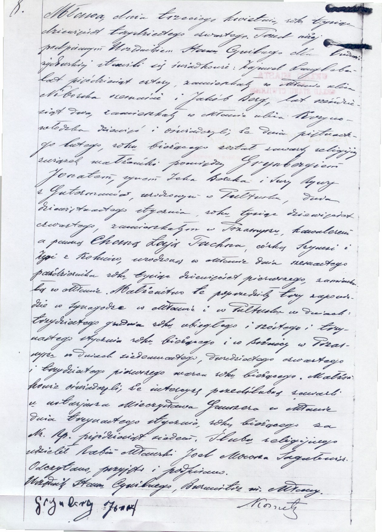 The marriage preceded three banns in the synagogue of Mlawa and Pultusk on the thirtieth of December of last year and the sixth and thirteenth of January of the current year and in the synagogue of Przasznysz on the seventeenth, twenty forth and thirty first of March of the current year. The married couple testified, that they concluded a pre-marital marriage settlement at notary Mieczyslaw Ganszer in Mlawa on the thirteenth of January of the current year under No. fifty seven.  The religious marriage was performed by the Rabbi of Mlawa, Joel Mowsza Sagalowicz.