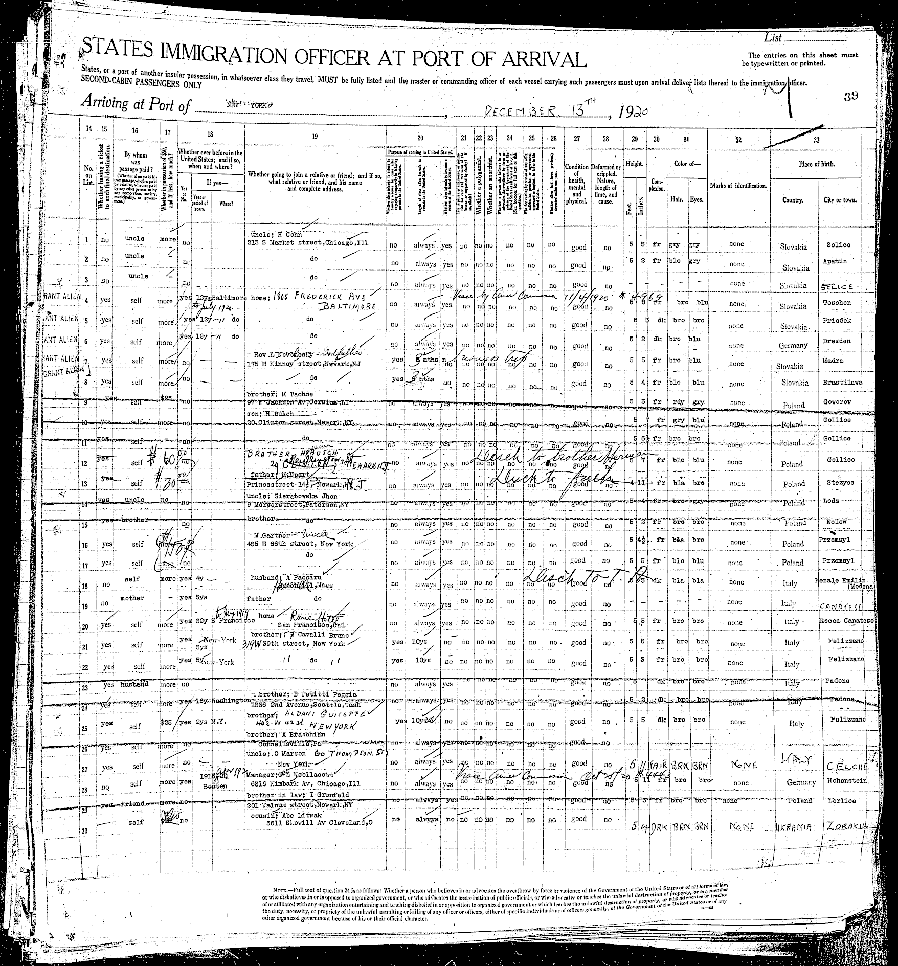 Arriving at Port of New York, December 13, 1920 |